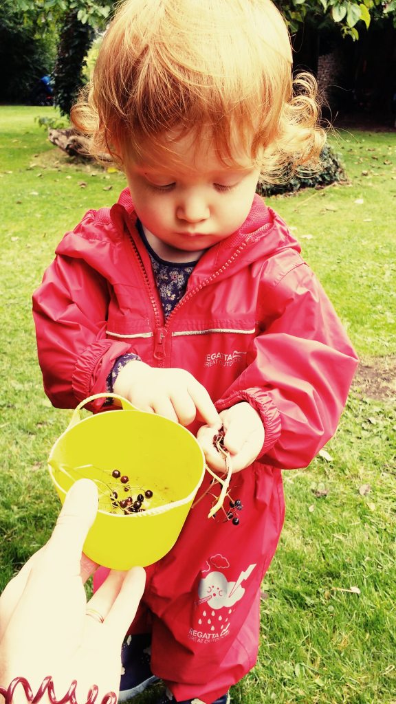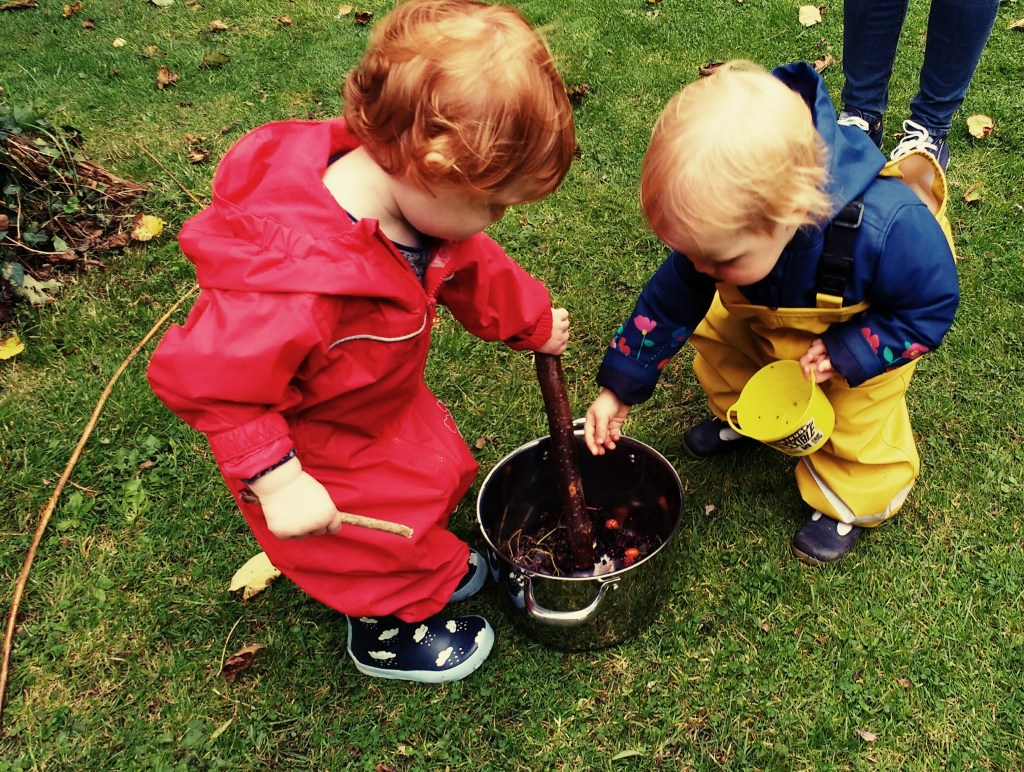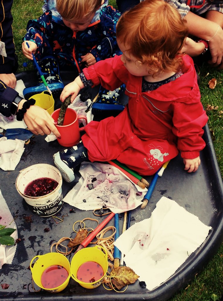 A big part of Forest School is to encourage children to explore freely and independently (which is hard when your child is just 18 months old) but the activities were designed to give children as much freedom as possible. The main activity of the session was making, and painting with, natural dye. We went foraging around the garden for elderberries and mulberries, picking them and popping them in a bucket before mashing them up into a paste using sticks we’d also found in the garden. The individual berry crops were put into a big pot, mixed with water and cooked on the campfire before the toddlers were given brushes and pieces of fabric and let loose with the dye, creating their own masterpieces. While foraging for berries and other garden produce is a fantastic activity for feeding curious minds, Claire was quick to teach us one of her class rhymes: “No pick, no lick, be careful with that stick,” which teaches children not to pick anything living, not to put anything in their mouths and to always be careful and safe. While Forest School encourages curiosity, it also provides boundaries that allow children to explore independently, but also safely, and this rhyme is a fun way to help them remember this!