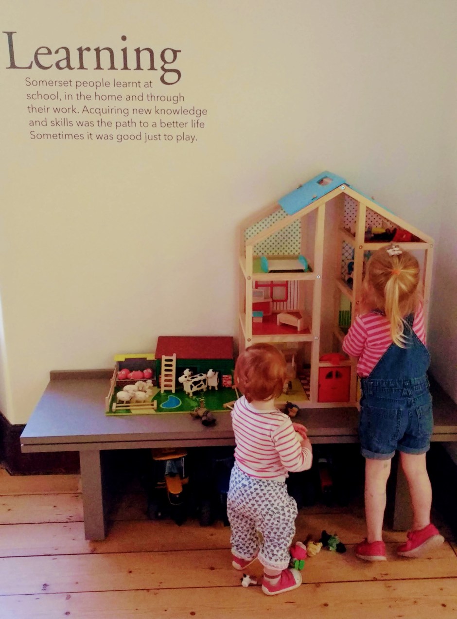 The museum itself tells the story of working life and the history of farming in rural Somerset. It’s got a replica Victorian farmhouse kitchen, various pieces of old farming equipment (complete with a taxidermy horse – which the Little Big One thought was pretend, thank goodness!) and some old fashioned clothes and items from the home, which prompted lots of questions from the curious preschooler! It’s a brilliant museum for kids to explore – everything is open and there’s nothing hidden away behind glass so it feels really accessible, even though you obviously still need to discourage them from touching the exhibits. If you head upstairs, there’s a room all about learning, which has a dolls house and a wooden farm, which I couldn’t drag my two away from. Outside in the courtyard, adjacent to where the toddler group took place, you’ll find an old tractor and a model “milking” cow which the Little Big One took great pleasure in trying out! Just off here is the orchard where there are a handful of sheep grazing and a picnic area set up with a few benches. There’s also a cafe if you fancy a cuppa and some cake or a light lunch.